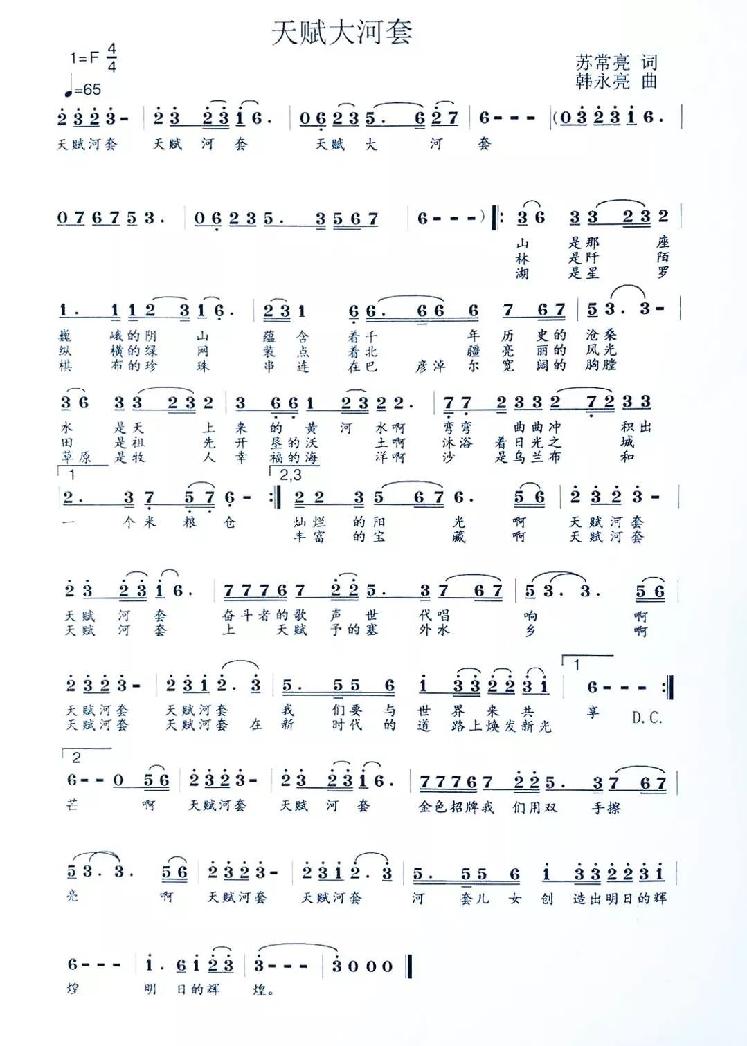 “啊,天赋河套/天赋河套/奋斗者的歌声世代唱响/啊,天赋河套/天赋河套/我们要与世界来共享/上天赋予的塞外水乡/在新时代的道路上焕发新光芒/金色招牌我们用双手擦亮/河套儿女创造出明日的辉煌!”